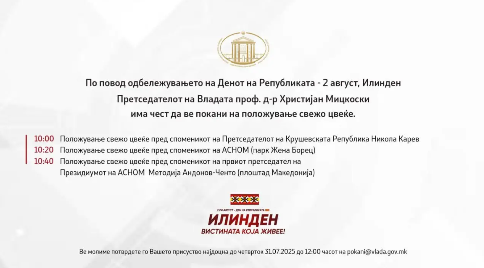 Од прес службата на Влада информира дека по повод чествувањето на големиот празник 2 Август – Ден на Републиката – Илинден, Претседателот на Владата на Република Македонија, Христијан Мицкоски ќе положи свежо цвеќе на следните локации во Скопје: